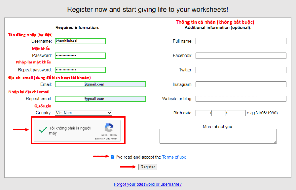 Ở giao diện này, chúng ta cần nhập các thông tin cơ bản như tên người dùng (để sau này sử dụng), tạo mật khẩu, cung cấp địa chỉ email để kích hoạt tài khoản (như ảnh trên). Sau khi nhập các thông tin cần thiết, cần chọn Register để tiếp tục (phải tích vào ô Tôi không phải là người máyI’ve read and accepted the Terms of use).