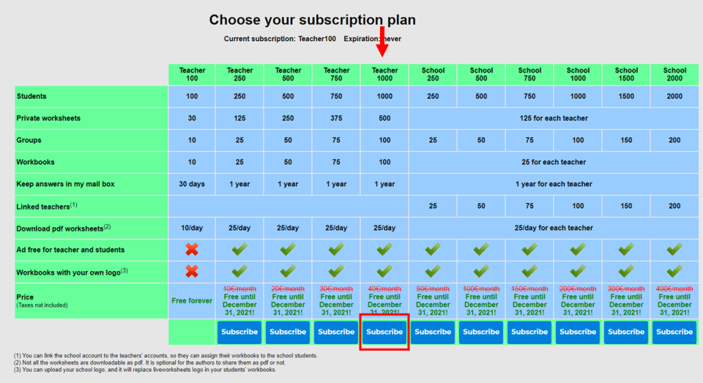 2. Tìm và chọn cột Teacher 1000, bấm Subscribe ở cuối cột.