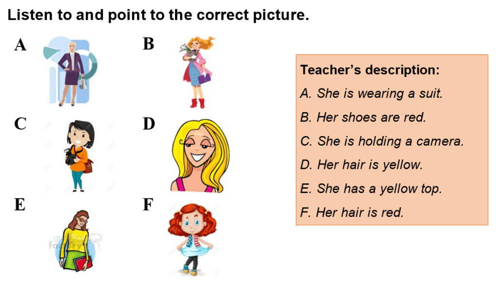 Learners at the initial stage of their language learning process must go through a silent period, just like babies keep silent until they first utter an intelligible sound. This does not mean they do not learn language. Instead, they learn it receptively, processing the language and storing information. Similar to how a baby may react non-verbally to something around, tasks for low-level learners, particularly complete beginners, should not ask them to produce the language but show how they have processed it through non-verbal media. Professor Rod Ellis even emphasized that for these low-proficiency learners, the PPP approach, which is now very prominent in the Vietnamese teaching context, is relatively less effective. I would say it is less suitable since students need to have enough language input before reaching the production stage – the last P. The example of Professor Rod Ellis has been adapted into the following picture. Students must listen to the teacher’s sentences and point to the correct picture.