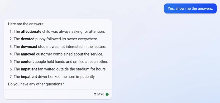 Bing Chat loves to quiz you on various vocabulary topics, ranging from synonyms, antonyms, and definitions to collocations, idioms, and more. You can even customize the difficulty level of the questions, making it suitable for your learning needs. Additionally, Bing Chat allows you to adjust the format of the questions to match your preferences.