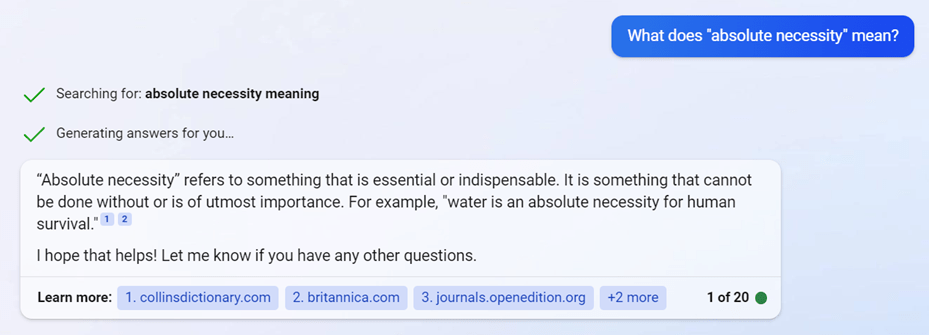 However, most of the questions on single words, regarding meaning, usage, pronunciation, origin, or collocations, can also be found in the dictionaries that we use regularly. What I find interesting and helpful is the questions and answers given on phrases, which sometimes I cannot answer using dictionaries. For instance, here is my question and Bing Chat’s response on the collocation “absolute necessity”, whose meaning can only be showned by through the seperate definitions of “absolute” and “necessity” on some online dictionaries