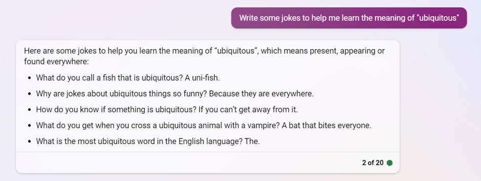 I also tried to ask Bing Chat to generate some jokes related to the word. Although the jokes are not really funny (to me), they are still helpful in reminding me of the meaning of “ubiquitous”. By the way, to maximize the creativity of these responses, you should choose the “More Creative” conversation style.