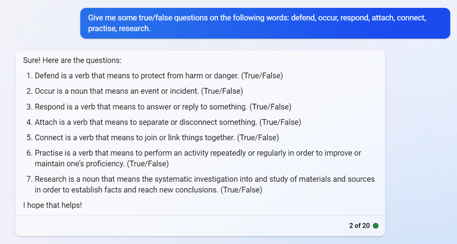 For example, here are some True/False questions that Bing Chat generated for me on a list of words that I provided. Most of the time, if I do not specify the focuse of my questions, Bing Chat will go for questions testing my remembering of the words’ meaning.